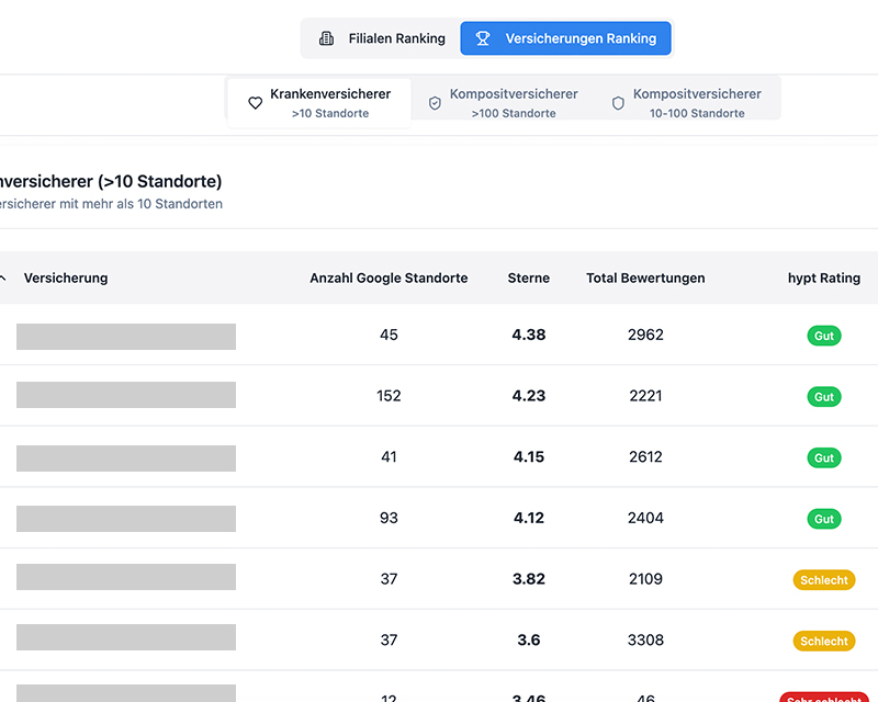 Erfahre, ob dein Versicherungsunternehmen oder deine Agentur im Top-Ranking vertreten ist – und vergleiche die Bewertungen anderer Versicherer.